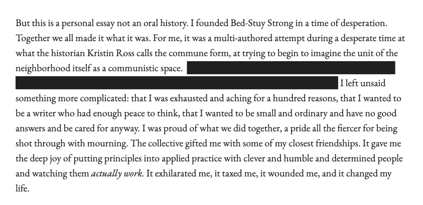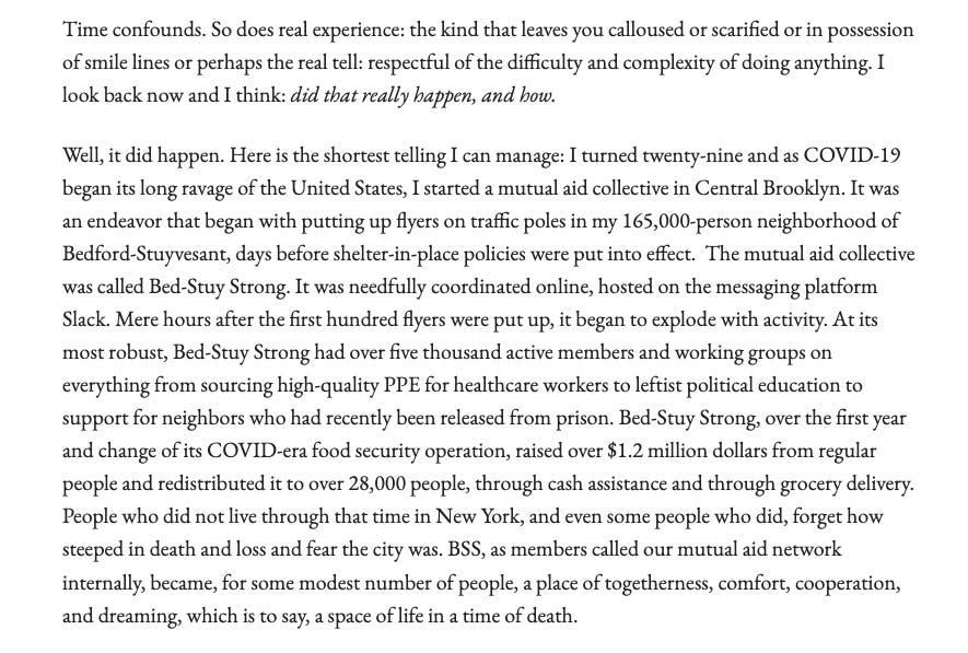 I have an essay in there too. It’s titled The Opposite of Loneliness. It’s a telling of some of my experiences organizing in Brooklyn during the height of COVID. I almost never write about the details of my organizing projects in public. This is one departure.
