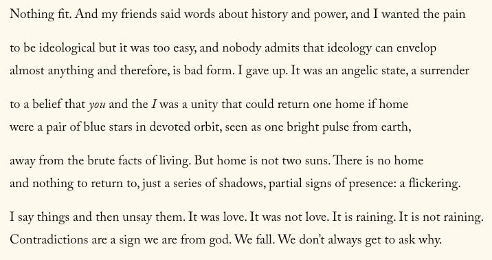 Things can change in a day. It’s a line repeated throughout Arundhati Roy’s The God of Small Things, a refrain that is factual and ominous at once, foreshadowing the novel’s malayali gothic turns. On my desk in my stewed-raspberry room is a small framed gift from my friend Meg, an excerpt from her poem Drive, with the lines: I say things and then unsay them. It was love./ It was not love. It is raining. It is not raining. / Contradictions are a sign we are from god / We fall. We don’t always get to ask why.