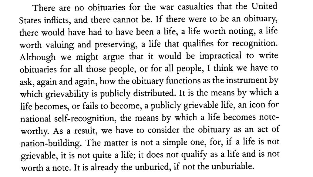 Grievability is a concept that I first encountered when reading Judith Butler. “Specific lives cannot be apprehended as injured or lost” Butler wrote in Frames of War, “if they are not first apprehended as living.” Grief, in their account, is not merely an emotion but a political capacity: it marks the boundary of who is recognized as human at all. To be publicly mournable is to have been admitted, however briefly, into the category of life that counts.